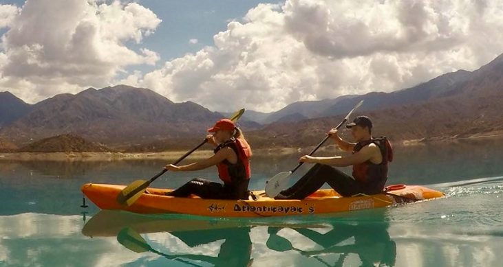 Navegación por el río Mendoza con rápidos clase II+/III: comandos, remada en equipo, “baños” controlados y fotos.  Luego remada guiada en el Dique Potrerillos: técnica básica, virajes y juegos.