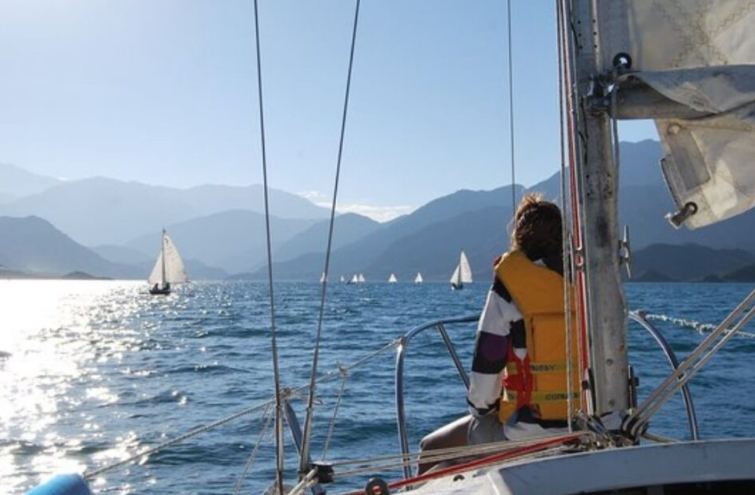Zarpe: navegación por el lago visitando bahías y parajes; charla técnica (nudos, rumbos, aparejo) e introducción a la vela.